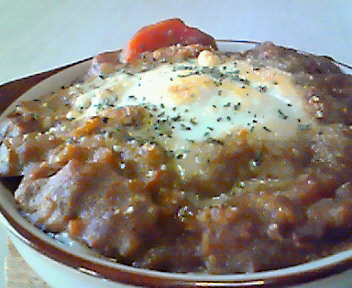 カレーを入れて真ん中にくぼみを作って玉子を割り入れる。