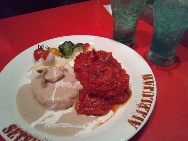 刹/那の白いカ/レーとア/レル/ヤのピリ辛トマトソースをかけたライス