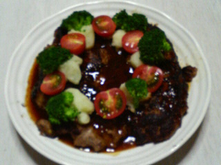 でかいハンバーグにブロッコリーとプチトマトマッシュポテトでデコレーションしました。