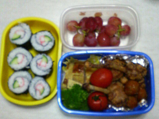 カニカマときゅうりの海苔巻き・手羽元(チューリップ)からあげ・出汁巻き卵・フルーツです。